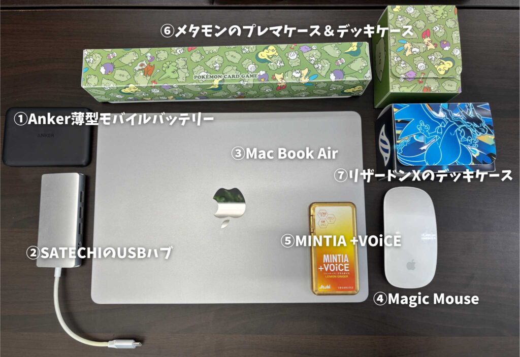 ②SATECHIのUSBハブ / ③MacBook Air