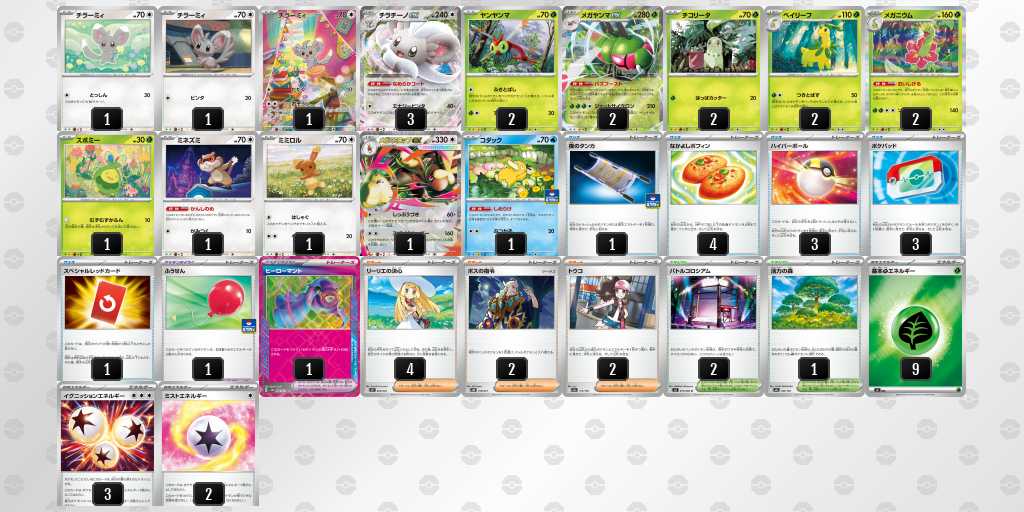 各タイプごとのデッキ検索 チラチーノexデッキまとめ X Facebook LINE Pinterest コピー 2026.03.22 記事内に広告が含まれています。 ポケモンカードゲーム MEGA 拡張パック ニンジャスピナー BOX created by Rinker ポケモン(Pokemon) Amazon 楽天市場 Yahooショッピング 本記事の内容 チラチーノex最新優勝・入賞デッキレシピまとめ 公式デッキコードの掲載 シティリーグ優勝・入賞デッキレシピまとめ 目次 優勝・入賞デッキレシピまとめニンジャスピナー環境 優勝・入賞デッキレシピまとめ 🏆 順位で絞り込むすべて優勝準優勝以上ベスト4以上ベスト8以上ベスト16以上 ニンジャスピナー環境 03/21 【ジュニア】シティリーグ:ベスト4店舗:ポケモンセンターヒロシマ(広島)プレイヤー:よげんねこ選手デッキコードデッキ作成QHNNnL-xf4MP6-n9g6gQ1人回し(1面)1人回し(2面)>>大会結果はこちら03/20 シティリーグ:ベスト4店舗:TCG桜華(愛媛)プレイヤー:チ。選手デッキコードデッキ作成8K8cDG-WJbyYW-xx44Dx1人回し(1面)1人回し(2面)>>大会結果はこちら