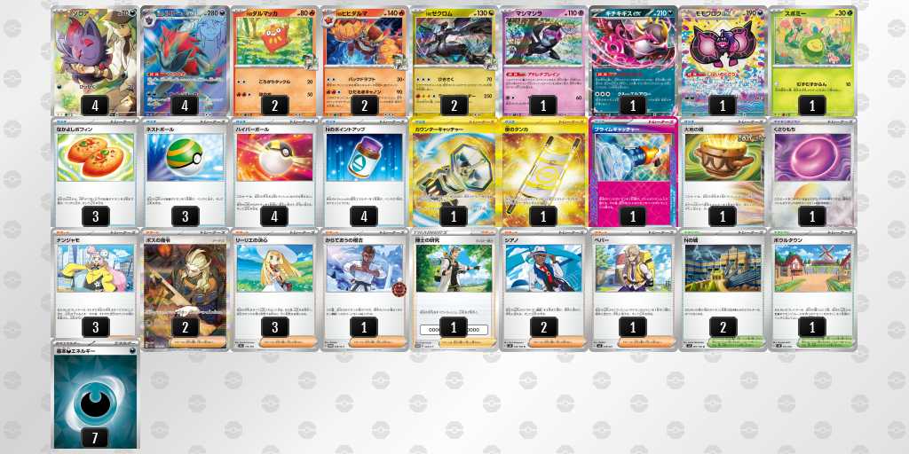 MEGAドリームexのカードリストが徐々に公開されていく際に、環境に刺さりそうだなと思って選びました。全公開されてでんきだまがあったのを見た時、これはバチュルに勝てないなと思いましたが、当日踏みませんでした。初CL、とても楽しめました!