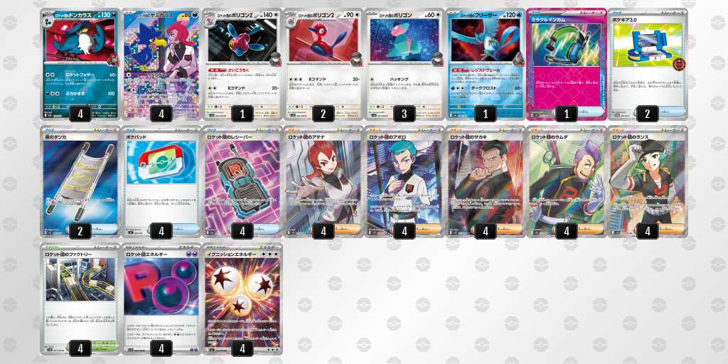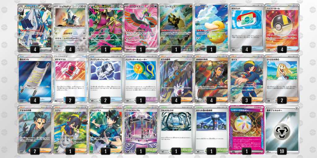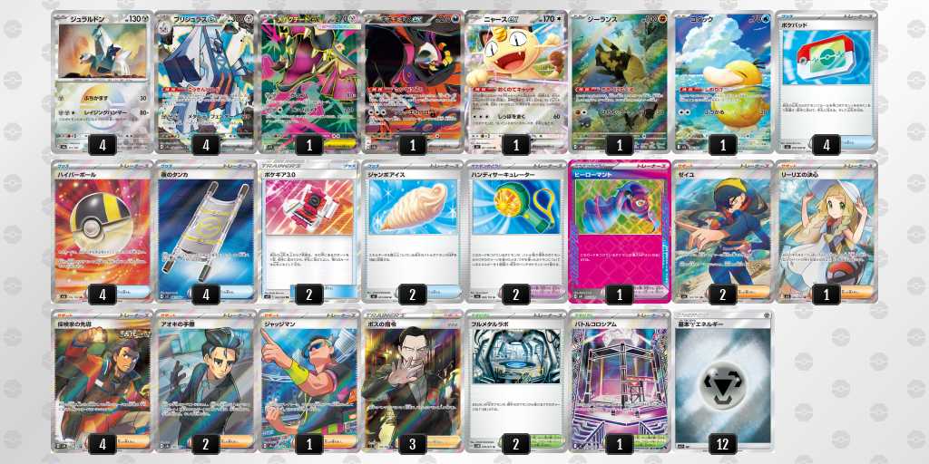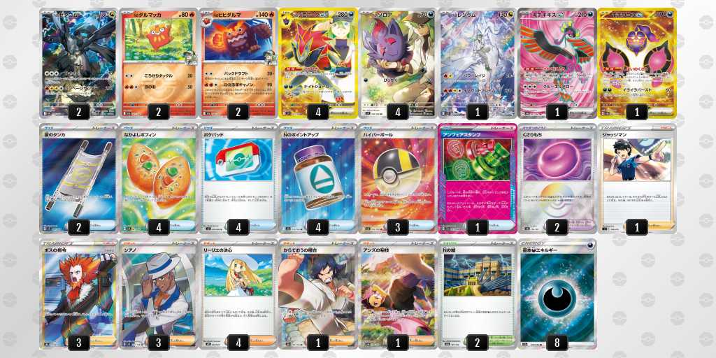 環境上位のデッキに強く意識。ブルンゲル砂時計で4エネ揃いやすかったり、つけかえマシマシラで幅広い対面とアンフェア対策。