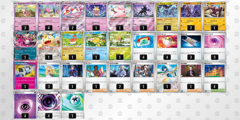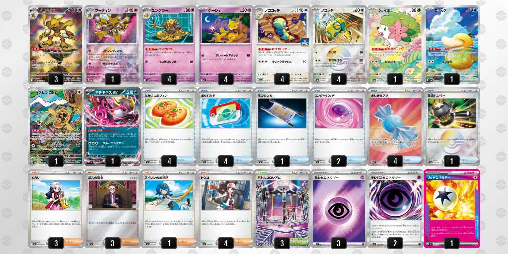 ドラパルト、ルカリオが中心の環境でルカリオ対面がきつく、ピッピorマシマシラで攻撃できるように超エネをいれた。序盤の安定感のためにキチキギスやサポートの採用枚数の検討が必要だった。