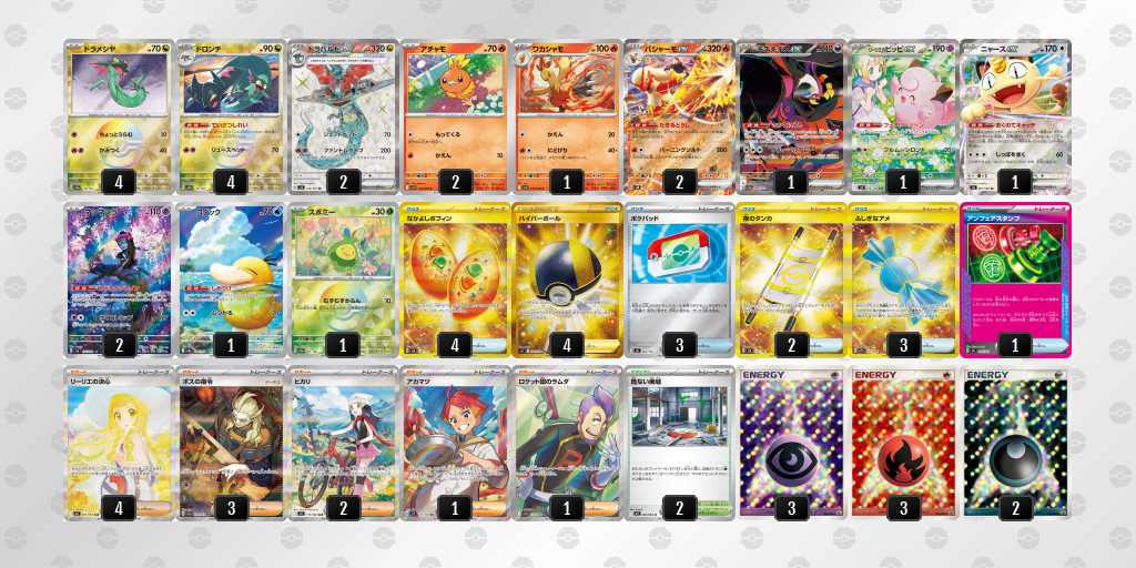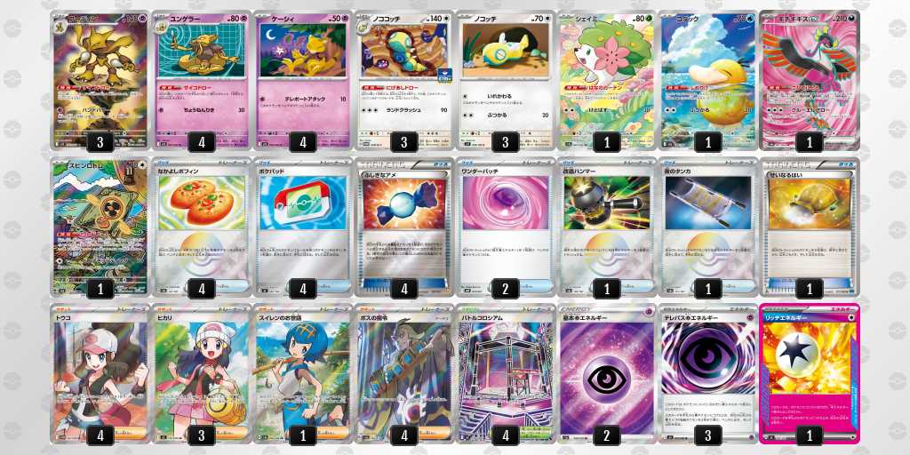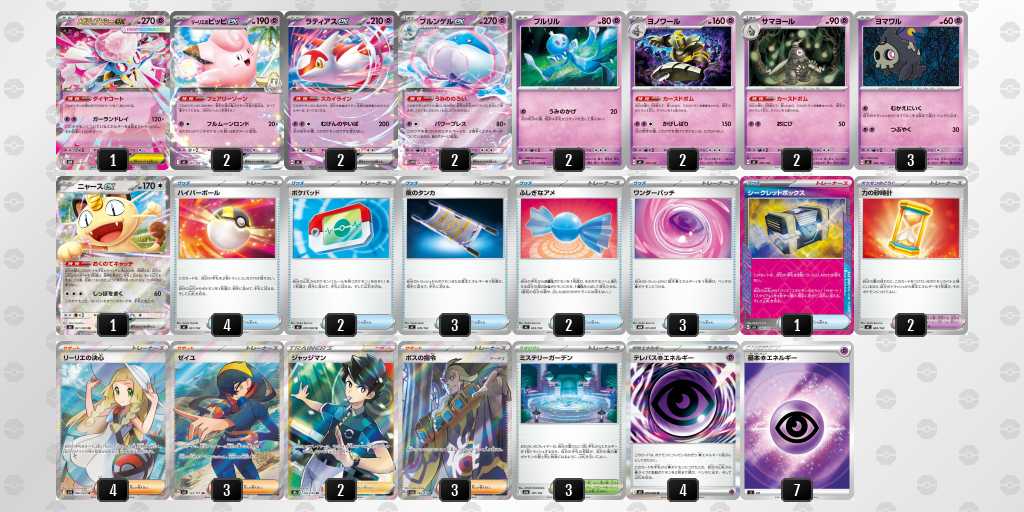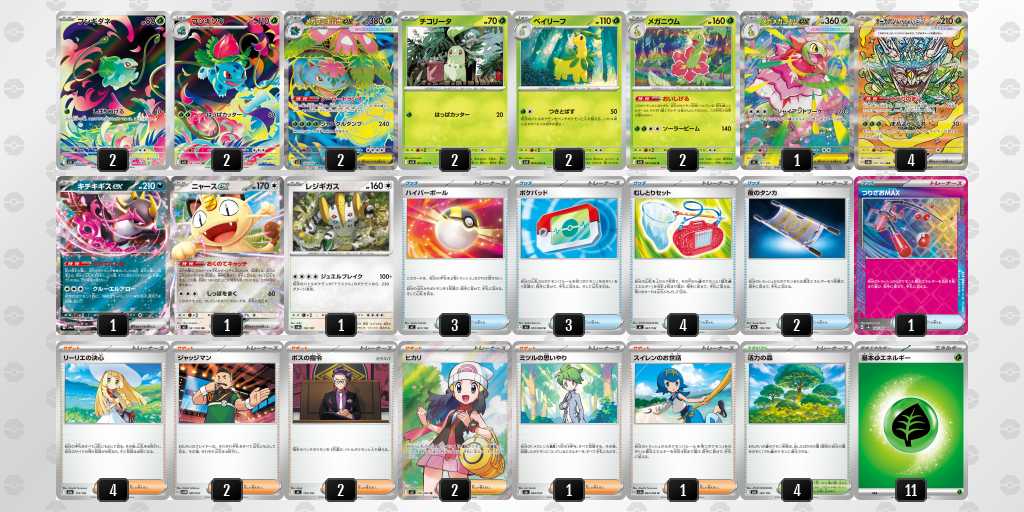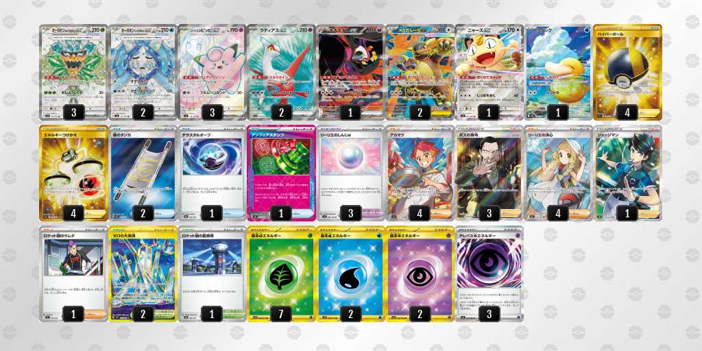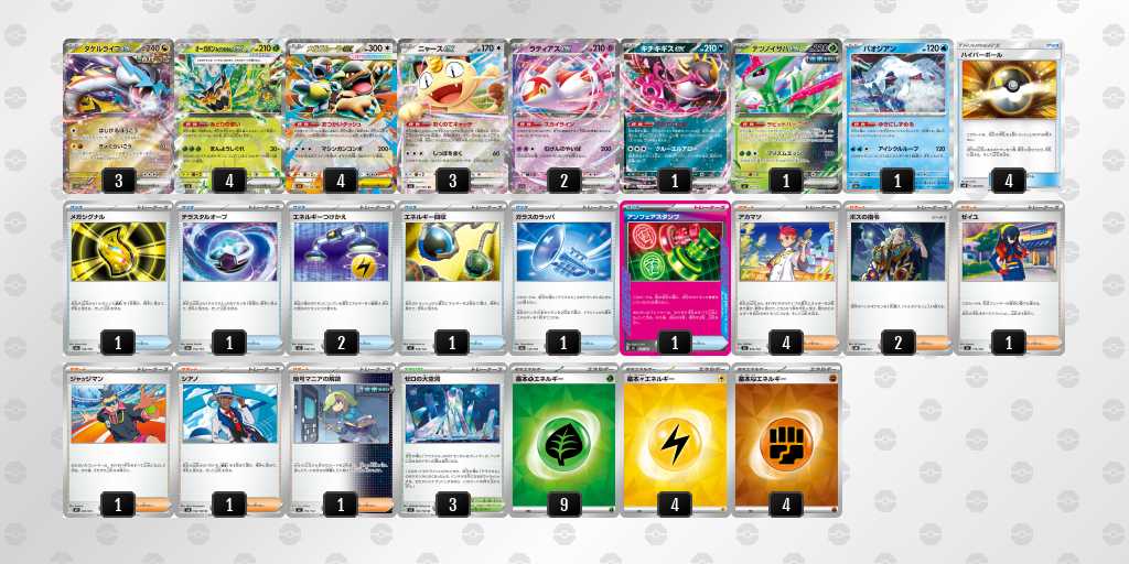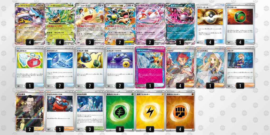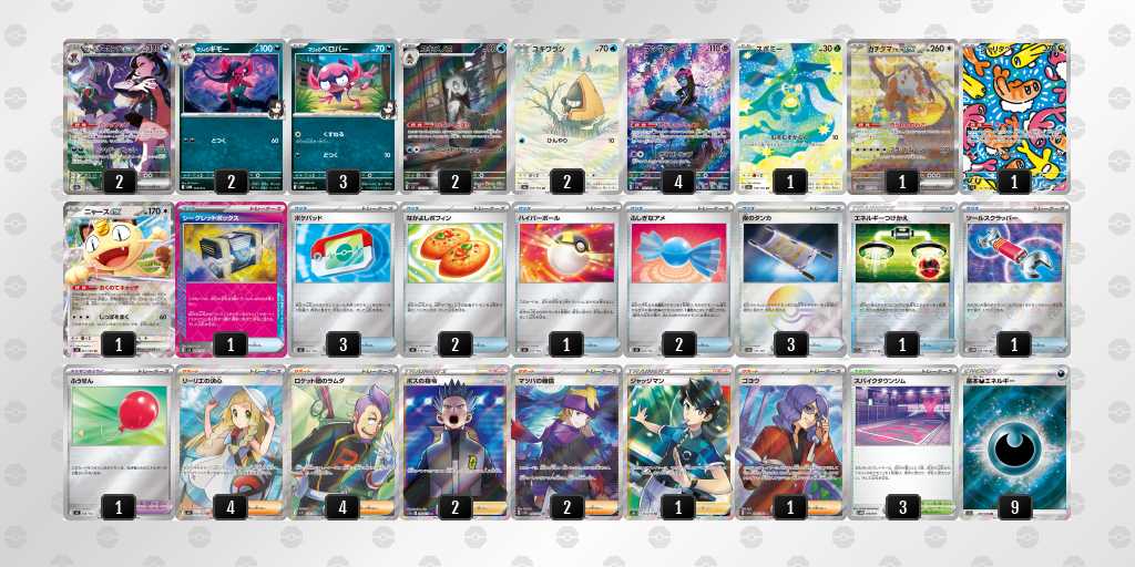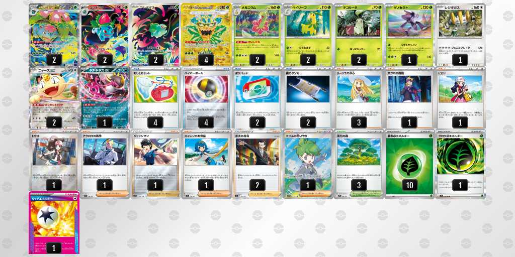 後1きょくらいごうの成功率がかなり高いデッキです。エネも16枚入っているので、がんがんきょくらいごうしてもアカマツを問題なくうてます!緑オーガポンにエネを9枚つけて、相手のメガガルーラをプライムキャッチャーブライアで倒して勝てたときは嬉しかったです!