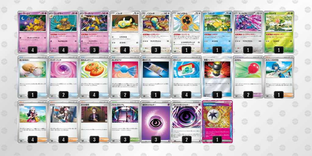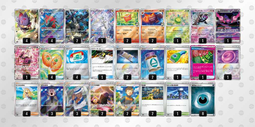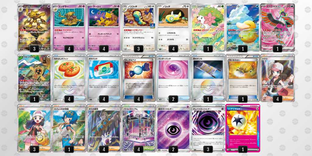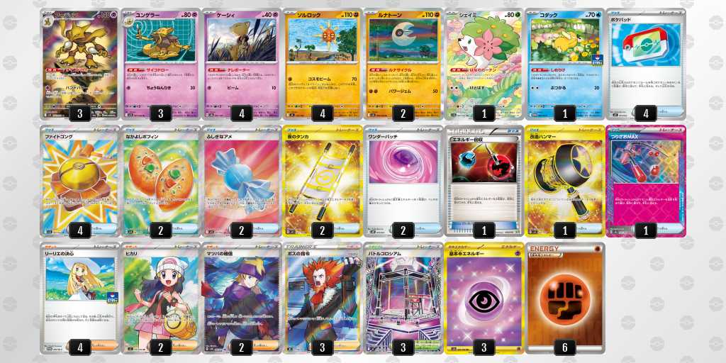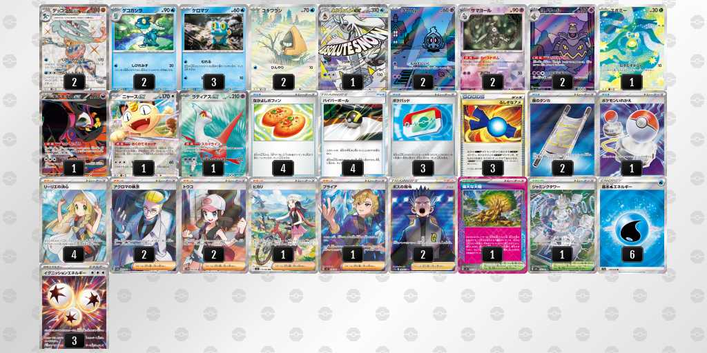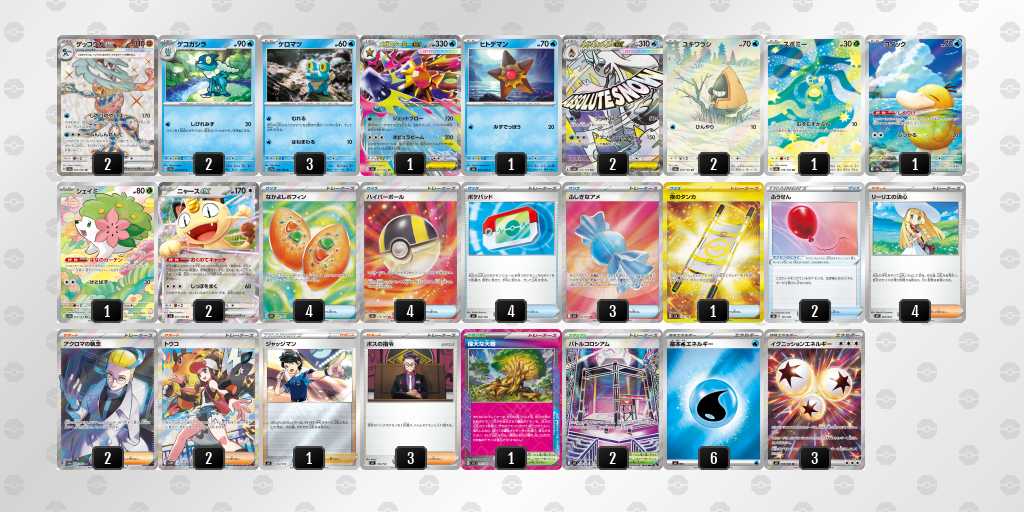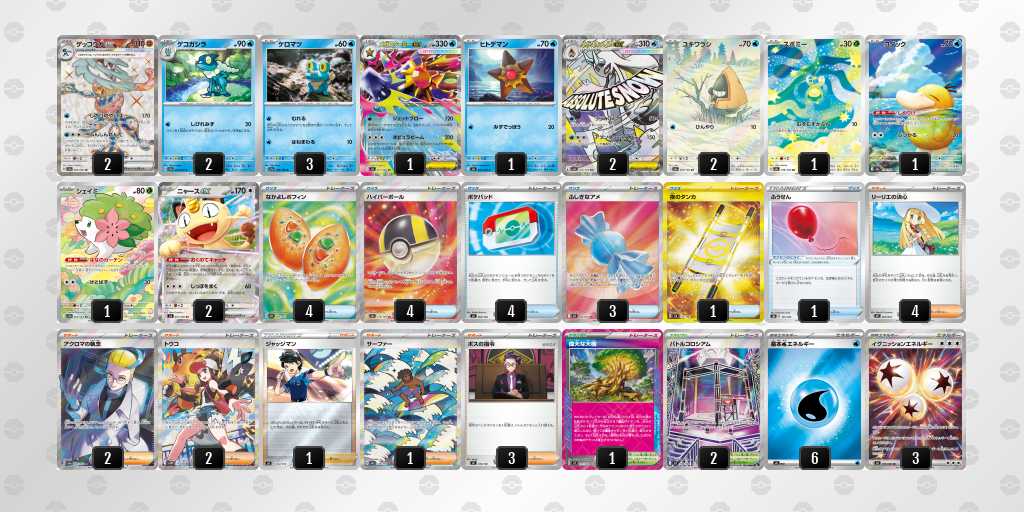 初めてday2に進出できました!ゲッコウガはぶんしんれんだを使用して、2進化ポケモンのアタッカーをなるべく早めに一掃し、しのびのやいばで必要札をしっかり確保することを目指します。メガスターミーでフーディンデッキをケーシィ含めて1エネでまとめ取ること、オーガポン系列をイグニッションでワンパン、万が一のイワパレスにも対応できるようにしています。また、メガユキメノコで相手が手札を増やすことに対して圧をかけたり、ゲッコウガでは届かない200ダメージ以上を出すことを目指します。それぞれ弱点が違うため、対面によってアタッカーを使い分けます。相手に取らせるサイド2-3-3にすることが理想的です。理想の動きは先攻2ターン目のぶんしんれんだを打つことなので、むずむずかふんをされても進化できるよう偉大な大樹を採用しています。