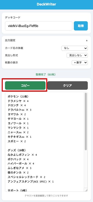 デッキページからコピーすること自体はできますが、ポケモン名にパック番号が含まれていたりして、そのままでは使いづらく、軽く編集が必要でした。