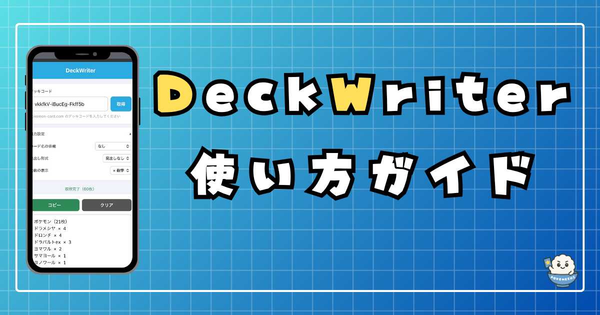 DeckWriterは、ポケモンカード公式サイト(pokemon-card.com)のデッキコードからカード一覧を取得し、コピーできるテキストに変換する無料ツールです。