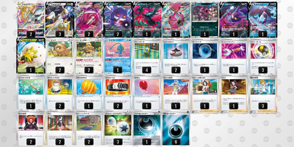 各タイプごとのデッキ検索 【ポケカ】ゲンガーVMAX優勝デッキまとめ X Facebook LINE Pinterest コピー 2023.09.08 記事内に広告が含まれています。 ポケモンカードゲーム MEGA 拡張パック インフェルノX BOX created by Rinker Pokémon Amazon 楽天市場 Yahooショッピング 目次 2022年03月22日(火)ゲンガーVMAX/ガラルマタドガス/ヘルガー/頂への雪道デッキ2022年03月24日(木)ゲンガーVMAX/ヘルガー/ビーダル/いちげきウーラオスV/イシヘンジンデッキ2022年03月27日(日):CL愛知ゲンガーVMAX/アルセウスVSTAR/ガラルファイヤーV/フーパVデッキ(マスター:ベスト64)2022年03月29日(火)ゲンガーVMAX/ヘルガー/カビゴン/頂への雪道デッキ2022年03月31日(木)ゲンガーVMAX/ヘルガー/頂への雪道デッキ2022年04月02日(土)ゲンガーVMAX/ヘルガー/ビーダル/あくの塔デッキゲンガーVMAX/ジュラルドンVMAX/ヘルガーデッキ2022年04月03日(日)ゲンガーVMAX/ビーダル/ヘルガー/クラッシュハンマー/頂への雪道デッキ2022年04月04日(月)ゲンガーVMAX/ヘルガー/ビーダル/ガラルファイヤー/頂への雪道デッキゲンガーVMAX/ヘルガー/ビーダル/ミュウ/頂への雪道デッキ 2022年03月22日(火) ゲンガーVMAX/ガラルマタドガス/ヘルガー/頂への雪道デッキ エントリー名:「Ia」さんゲンガー デッキ全勝おめでとうございます✨#ポケカ #ポケモンカードゲーム #ポケカデッキ pic.twitter.com/0DcyGNPB1v— 【公式】Tonamel(トナメル) (@TonamelJP) March 22, 2022 【ポケカ】大会優勝デッキまとめ(2022年03月22日)【シティリーグ(大阪)・ジムバトル】【バトルリージョン環境】03/22(火)のシティリーグ(大阪)結果、ジムバトル優勝デッキをまとめました。 2022年03月24日(木) ゲンガーVMAX/ヘルガー/ビーダル/いちげきウーラオスV/イシヘンジンデッキ 本日のポケモンカード新弾バトル参加者17名優勝:アリエスさんデッキ名:初めてでてみて優勝したのでとても嬉しいです。おめでとうございます🎉#秋葉原チェルモ pic.twitter.com/YM8zLA9ZWQ— 秋葉原チェルモ cherumoAKIBA (@cherumo2010) March 24, 2022 【ポケカ】大会優勝デッキまとめ(2022年03月24日)【シティリーグ(神奈川・大阪)ジムバトル】【バトルリージョン環境】03/24(木)のシティリーグ(神奈川・大阪)結果、ジムバトル優勝デッキをまとめました。 2022年03月27日(日):CL愛知 ゲンガーVMAX/アルセウスVSTAR/ガラルファイヤーV/フーパVデッキ(マスター:ベスト64) 改めてCL愛知、ゲンガーアルセウス使用で7-2、ギリギリ64位でした構築的に厳しいミルタンクと当たらなくて良かったです予選三回戦であの超有名プレイヤー、がびまる選手とマッチングできたのが一番の思い出です!完敗でした!対戦ありがとうございました! pic.twitter.com/Sbyka6xsa8— ねげろ (@ngrsm9) March 27, 2022 【CL2022愛知】チャンピオンズリーグ2022 愛知 スタンダード優勝&上位入賞デッキレシピまとめ【ポケカ】3/27(日)愛知で開催されたチャンピオンズリーグ2022のスタンダード上位デッキレシピをまとめました。関連noteや動画のリンク付です。バトルリージョン環境の結論がここに! 2022年03月29日(火) ゲンガーVMAX/ヘルガー/カビゴン/頂への雪道デッキ 3/29(火) 18:30より開催のポケモンカード 新弾バトル オープンの結果です参加者は4名でした優勝:あっくん様デッキ:ゲンガーカビゴンひとこと:カビゴン使いませんでした!優勝おめでとうございます!30日(水)は18:30からデッキそのままバトルが開催ですご参加をお待ちしております! pic.twitter.com/wwJZGYAIa0— TSUTAYA六高台店 (@torepa_rokkou) March 29, 2022 【ポケカ】大会優勝デッキまとめ(2022年03月29日)【ジムバトル】【バトルリージョン環境】3/29(火)開催のジムバトル優勝デッキをまとめました。 2022年03月31日(木) ゲンガーVMAX/ヘルガー/頂への雪道デッキ 【ジムバトル】TSUTAYA流山おおたかの森使用デッキ おジャマゲンガー①不戦勝②アルセウス単6-5⭕️③マタドガスダークライ6-0⭕️優勝(ジャマー付き)(一撃2エネ)ゲンガーvmaxがおまもりアルセウス倒した場面があった。前に3エネつける必要がなかったのでとても強かったプロモマニュきた pic.twitter.com/1vPrRcjKq3— あっくん (@Gori4lla) March 31, 2022 【ポケカ】大会優勝デッキまとめ(2022年03月31日)【ジムバトル】【バトルリージョン環境】3/31(木)開催のジムバトル優勝デッキをまとめました。 2022年04月02日(土) ゲンガーVMAX/ヘルガー/ビーダル/あくの塔デッキ 【大会報告】4月2日開催~ポケモンカードゲーム~◆ジムバトル◆優勝は『ゲンガービーダル』デッキを使用した【ヒラノ】さんでした。おめでとうございます~♪#ポケカ pic.twitter.com/lyACYjoIXg— TSUTAYAフレスポ赤穂店 (@AKOTSUTAYA_TCG) April 2, 2022 ゲンガーVMAX/ジュラルドンVMAX/ヘルガーデッキ 4月2日(土)15時〜 ジムバトル 🏆優勝者🏆\\\Takahashiさん////デッキ名『ゲンジュラ🏢』コメント「かかってこい!ヽ('ヮ'*)ゝ」🥳🤩😊おめでとう御座います🎊#ポケモンカード #ポケカ #優勝デッキ#手が pic.twitter.com/0N140IEYGZ— 石とカードの森 (@ishi_card_mori) April 2, 2022 【ポケカ】大会優勝デッキまとめ(2022年04月02日)【ジムバトル】【バトルリージョン環境】4/2(土)開催のジム