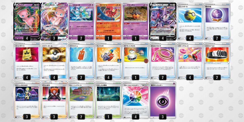 各タイプごとのデッキ検索 【ポケカ】優勝デッキまとめ(2022年02月07日)【ジムバトル】 X Facebook Pocket LINE Pinterest コピー 2022.02.10 記事内に広告が含まれています。 ポケモンカードゲーム MEGA 拡張パック インフェルノX BOX created by Rinker Pokémon Amazon 楽天市場 Yahooショッピング 目次 ◆ミュウVMAXデッキミュウVMAX/ゲノセクトV/ウッウロボ/スマホロトム/トレーニングコート/ローズタワーデッキミュウVMAX/ゲノセクトV/ウッウロボ/スマホロトム/トレーニングコート/いにしえの墓地デッキミュウVMAX/ゲノセクトV/ウッウロボ/スマホロトム/トレーニングコート/いにしえの墓地デッキミュウVMAX/ゲノセクトV/ミュウ/クラッシュハンマー/いにしえの墓地/トレーニングコートデッキ◆こくばバドレックスVMAXデッキこくばバドレックスVMAX/アルセウスVSTAR/トレーニングコートデッキこくばバドレックスVMAX/アルセウスVSTAR/ザシアンV/ガラルフリーザー/クレセリア/トレーニングコートデッキ◆連撃カラマネロデッキ連撃カラマネロ/オクタン/インテレオン/シロナの覇気/トウキデッキ連撃カラマネロ/オクタン/チラチーノ/メッソン/みずの塔/頂への雪道デッキ◆れんげきウーラオスVMAXデッキれんげきウーラオスVMAX/インテレオン/オクタン/チャーレムV/メロン/みずの塔デッキれんげきウーラオスVMAX/アルセウスVSTAR/れんげきウーラオスVMAX/ガラルファイヤーV/ビーダル/トレーニングコート/崩れたスタジアム/頂への雪道デッキ◆ルカリオ(たけるとうき)デッキルカリオ(たけるとうき)/ビーダル/ガラルサンダー(けんきゃくチャージ)/トレーニングコートデッキルカリオ(たけるとうき)/インテレオン/トレーニングコート/頂への雪道デッキ【草】【炎】【水】【雷】ダダリン・リザードン・ブースター・白馬・グレイシア・ライチュウ 優勝デッキ【悪】【鋼】【龍】【無】【エクストラ】ムゲンダイナ・フーパファイヤー・ザシアン・ジュラルドン・ヨクバリス・エクストラ 優勝デッキ ◆ミュウVMAXデッキ ミュウVMAX/ゲノセクトV/ウッウロボ/スマホロトム/トレーニングコート/ローズタワーデッキ #ポケモンカード ジムバトルお疲れ様でした!本日の優勝は、クラリス様のミュウ&ゲノセクトデッキです!おめでとうございます!「シティ頑張ります!」とコメントいただきました!またのご参加お待ちしております。#ポケカ pic.twitter.com/1kI2q1Z1o4— 193秋葉原店@シャドウバースEVOLVE全力取扱‼️ (@akiba_193TCG) February 7, 2022 ミュウVMAX/ゲノセクトV/ウッウロボ/スマホロトム/トレーニングコート/いにしえの墓地デッキ エントリー名:「たあくん」さんミュウデッキ全勝おめでとうございます✨#ポケカ #ポケモンカードゲーム #ポケカデッキ pic.twitter.com/h40UcmMjVv— 【公式】Tonamel(トナメル) (@TonamelJP) February 7, 2022 ミュウVMAX/ゲノセクトV/ウッウロボ/スマホロトム/トレーニングコート/いにしえの墓地デッキ エントリー名:「どん」さんミュウデッキ全勝おめでとうございます✨#ポケカ #ポケモンカードゲーム #ポケカデッキ pic.twitter.com/RmvGDIP3hU— 【公式】Tonamel(トナメル) (@TonamelJP) February 7, 2022 ミュウVMAX/ゲノセクトV/ミュウ/クラッシュハンマー/いにしえの墓地/トレーニングコートデッキ エントリー名:「kage」さんミュウデッキ全勝おめでとうございます✨#ポケカ #ポケモンカードゲーム #ポケカデッキ pic.twitter.com/0iqTE0rI1L— 【公式】Tonamel(トナメル) (@TonamelJP) February 7, 2022 【ポケカ】ミュウVMAX優勝デッキまとめ【MewVMAX】環境トップデッキ!!ミュウVMAXの最新優勝デッキレシピをまとめていきます!【デッキコード付レシピも多数掲載!】 ◆こくばバドレックスVMAXデッキ こくばバドレックスVMAX/アルセウスVSTAR/トレーニングコートデッキ 【大会結果】本日の #ポケカ 新弾バトル優勝は、ぎんがさんです!デッキ名→黒馬アルセウス一言→クララが強かったです!とのコメントをいただきました!優勝おめでとうございます♪#オヤロコ pic.twitter.com/5qIySLR7Kk— TC バトロコ小山駅前 (@batoloco_oyama) February 7, 2022 こくばバドレックスVMAX/アルセウスVSTAR/ザシアンV/ガラルフリーザー/クレセリア/トレーニングコートデッキ エントリー名:「ぴーきよ」さんこくばバドレックス+アルセウスデッキ全勝おめでとうございます✨#ポケカ #ポケモンカードゲーム #ポケカデッキ pic.twitter.com/JYSY5f5Ze4— 【公式】Tonamel(トナメル) (@TonamelJP) February 7, 2022 【ポケカ】こくばバドレックスVMAX優勝デッキまとめ【黒馬】黒馬バドレックスVMAXの優勝デッキをまとめました。ポケカ内でも最強クラスの特性「めいかいのとびら」を駆使して環境を制圧! ◆連撃カラマネロデッキ 連撃カラマネロ/オクタン/インテレオン/シロナの覇気/トウキデッキ 本日19時より開催いたしましたポケモンカードジムバトル優勝はウメトラさんの「れんげきテンタクル」です!おめでとうございます🎉🎊🎉一言コメントは「じろちゃん誕生日おめでとう!」との事です!#ポケモンカードゲーム#ポケカ pic.twitter.com/wDJQe6KJL9— カードキングダム博多住吉店 (@ck_hakata) February