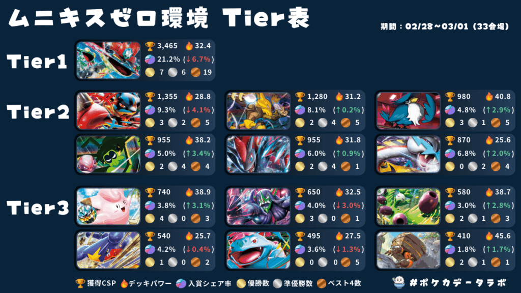 今までは、ポケカデータラボのX(旧Twitter)対戦自動集計の内容も掲載しておりましたが対戦自動集計機能がポケカデータバンク(PDB)に生まれ変わり、メンバーシップ限定のコンテンツとなりましたのでこちらからの参照もなしとなります。
