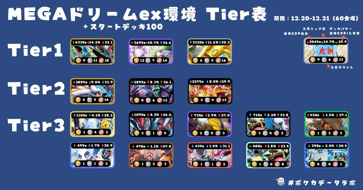 いろんな考え方がありますが単純にTier1~Tier4のように数字で表し、数字が小さいほど強いデッキとなります。また、強いデッキというとは大会では数も多くなるので大会の使用率にも直結してくるので対策がより必要なデッキであると考えることができます。