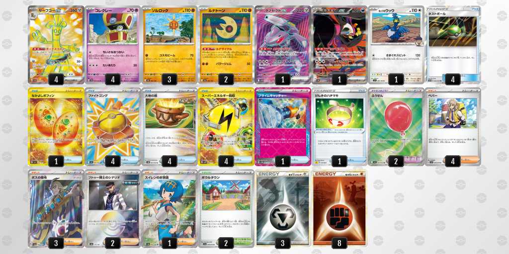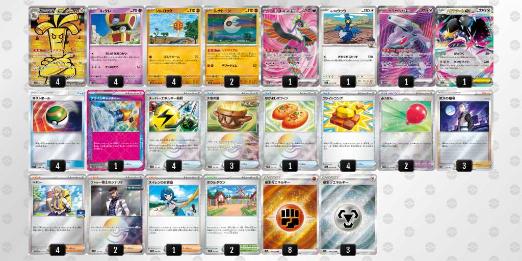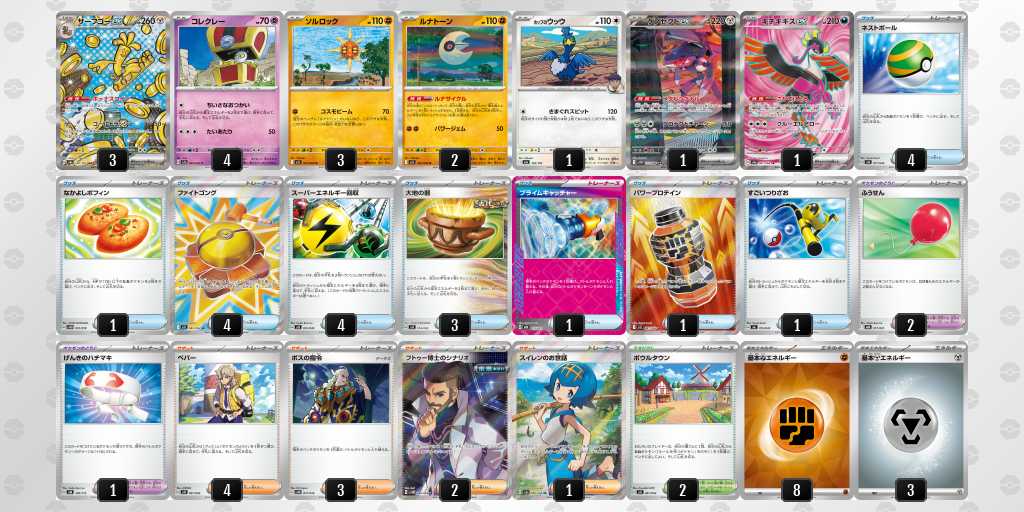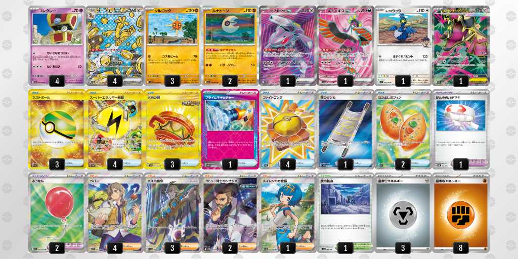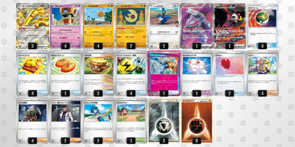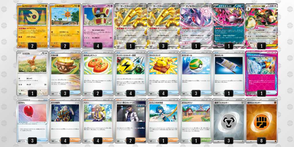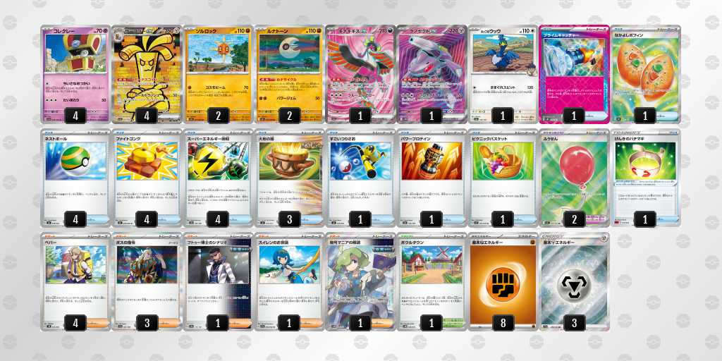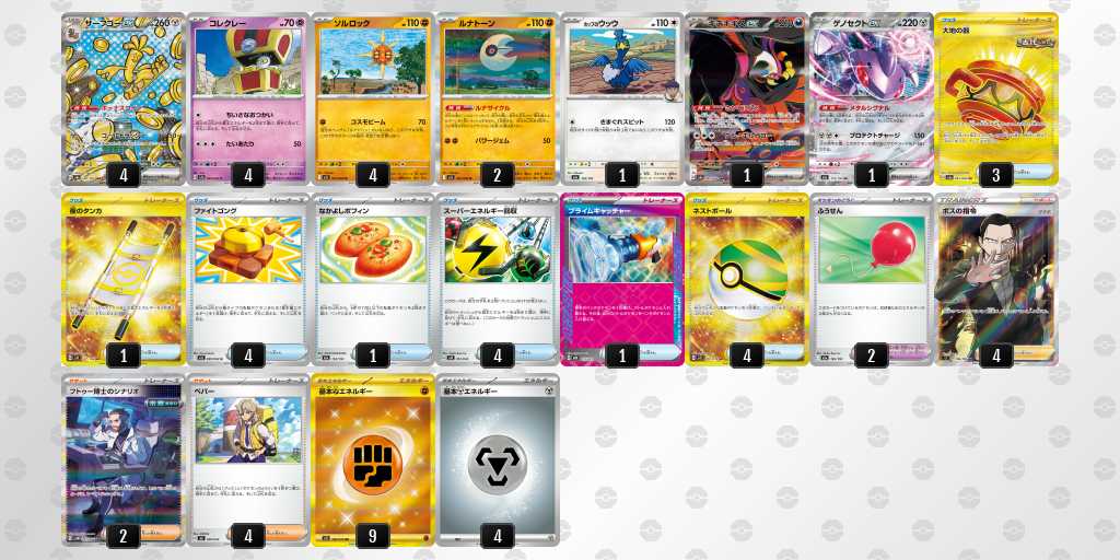 ソルロックが1エネ70ダメージ・弱点抵抗無視という仕様で、2進化の種ポケモンやラルトスなどにも有効。後攻1ターン目からサイドを進めやすい。