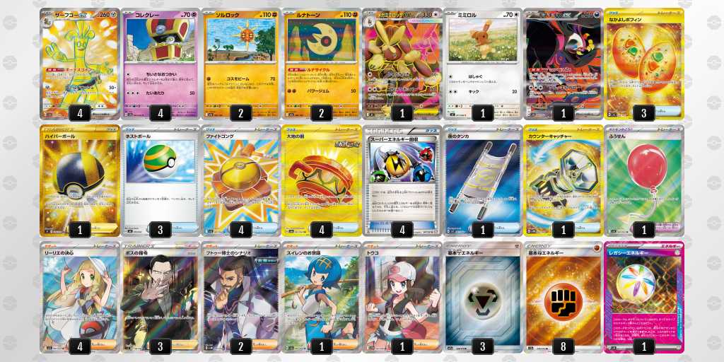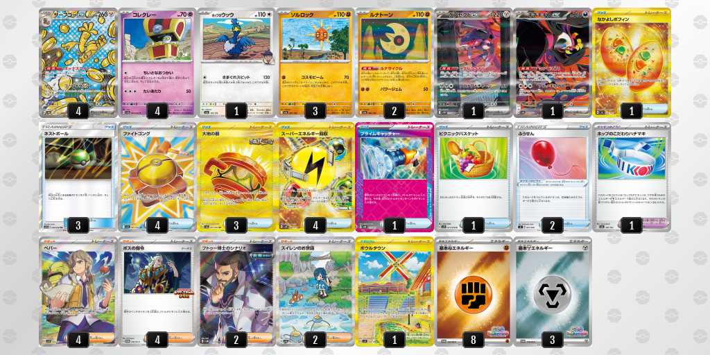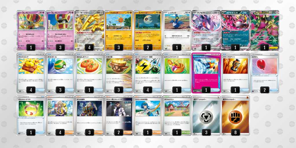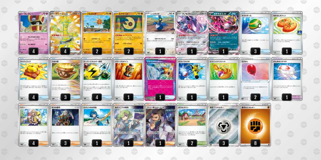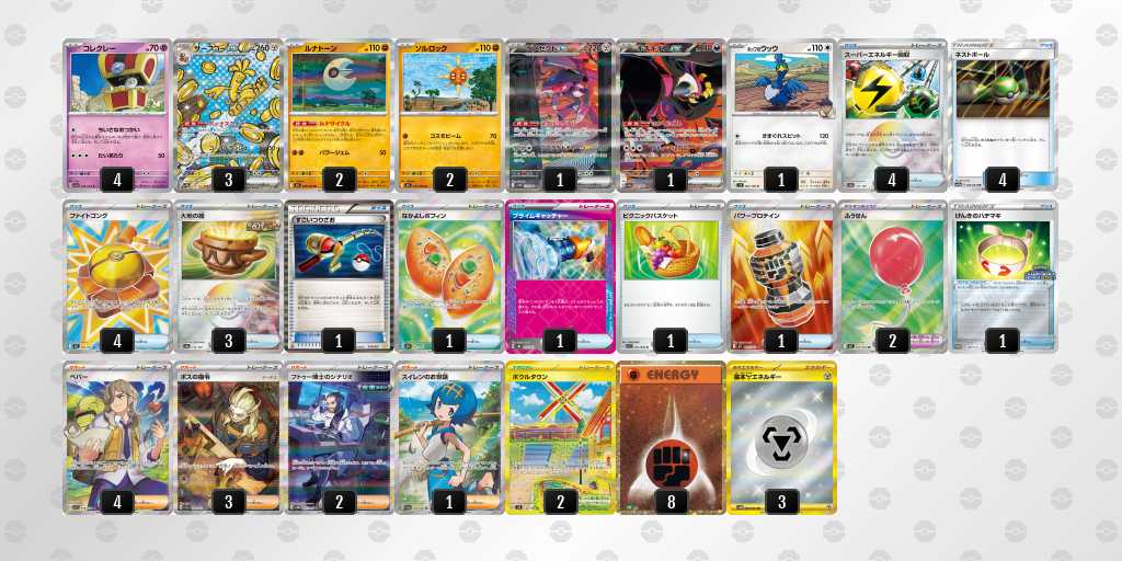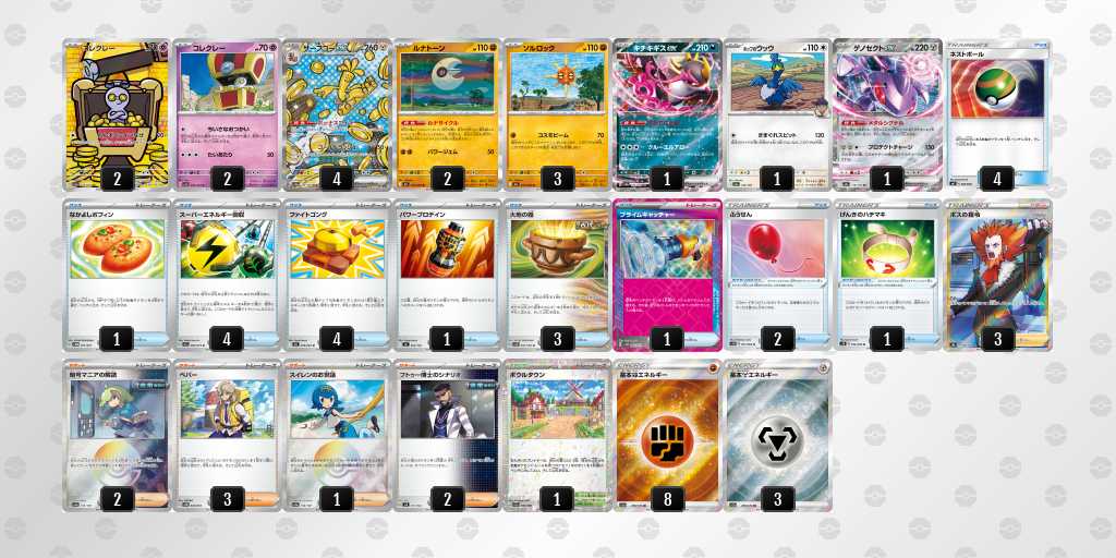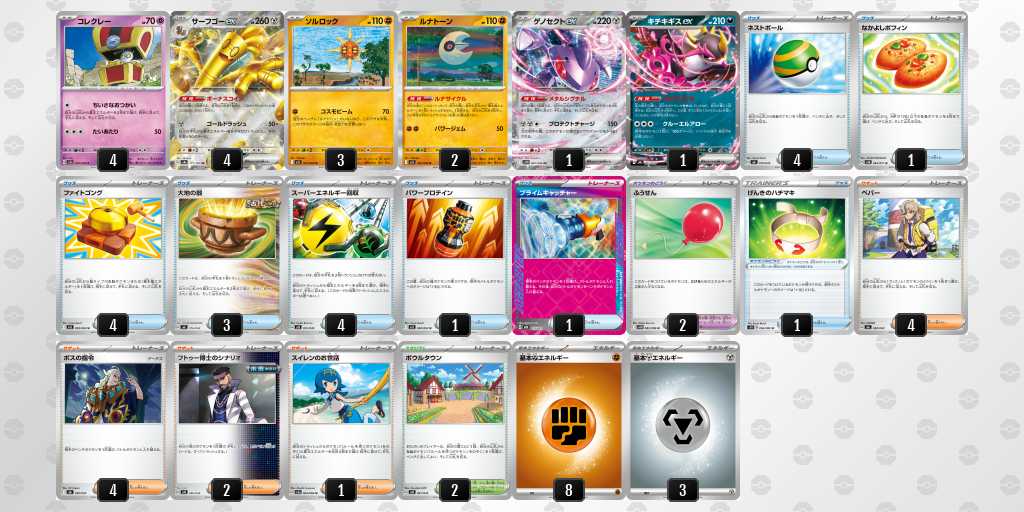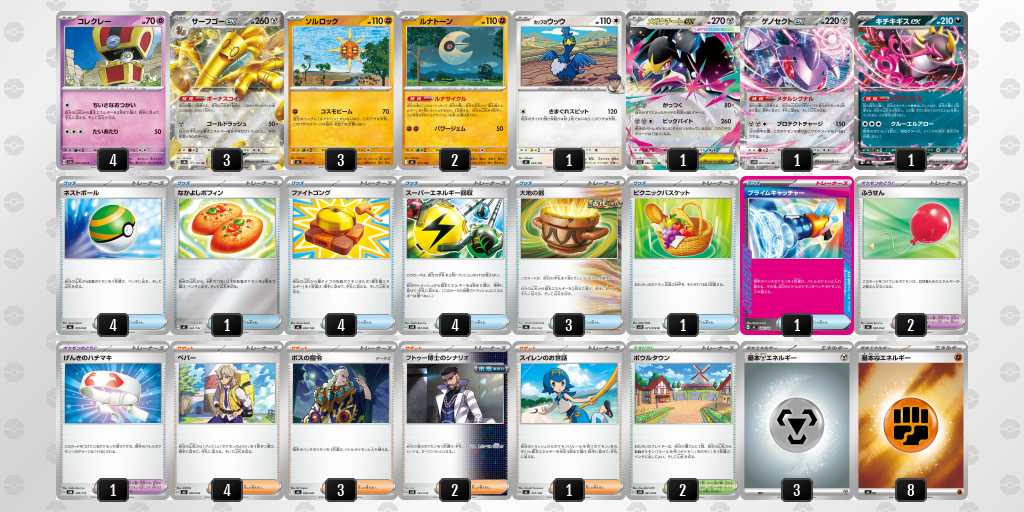 ソルロックが1エネ70ダメージ・弱点抵抗無視という仕様で、2進化の種ポケモンやラルトスなどにも有効。後攻1ターン目からサイドを進めやすい。
